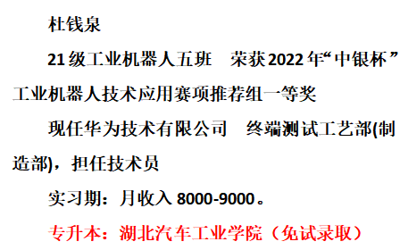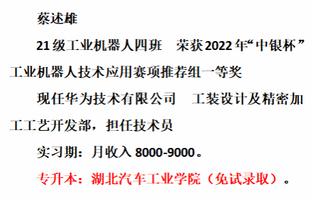 2023年,获湖北省职业院校技能大赛《工业机器人技术应用赛项》(高职学生组)推荐队、抽测队“双一等奖”。
