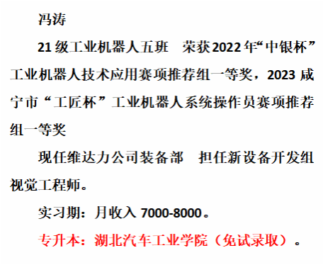 2024年,获湖北省职业院校技能大赛《工业机器人技术应用赛项》(高职学生组)抽测队“一等奖”、教师队“一等奖”。