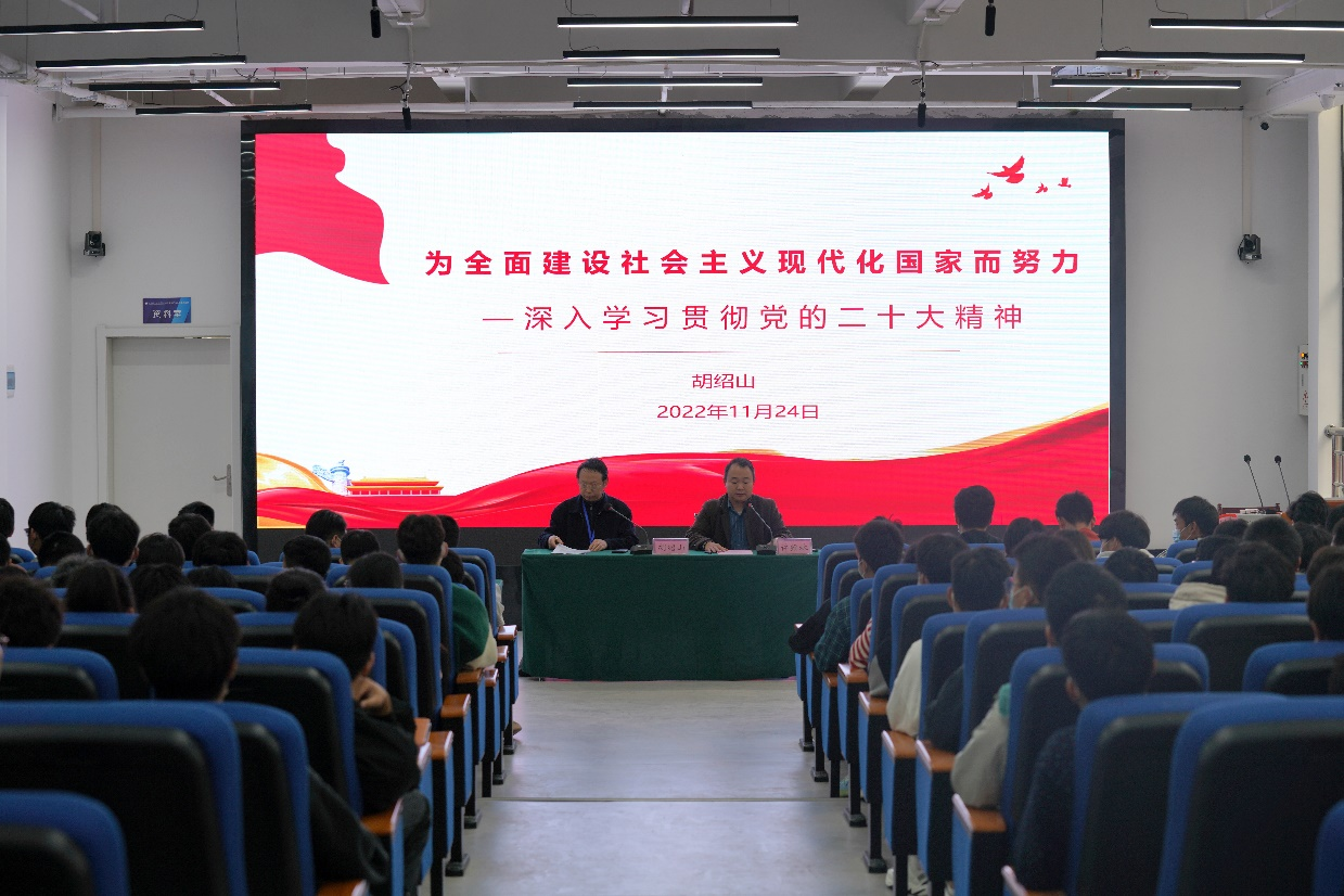 图3:党委委员、总会计师胡绍山为全体学生干部和入党积极分子为学生代表作党的二十大精神专题宣讲报告现场