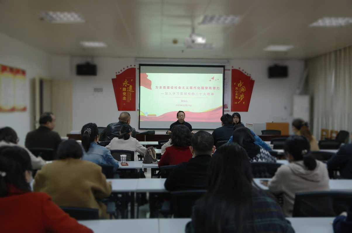 图1:党委委员、总会计师胡绍山在虚拟仿真大楼二楼学术报告厅作党的二十大精神专题宣讲报告现场