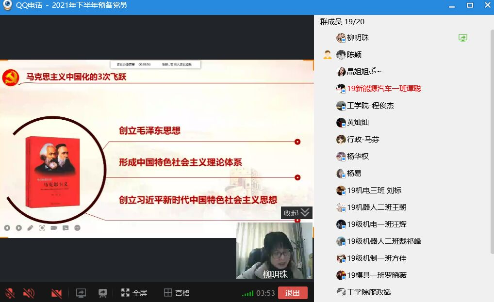 12月7 日下午,柳明珠在腾讯课堂为伟德国际victor1946学生支部全体党员及2021年下半年转正预备党员开展主题为“以史为鉴、开创未来、埋头苦干、勇毅前行——数览十九届六中全会”线上党课。课堂围绕一组数据“1、2、3、4、5、10、10、13、4”分九个部分从三个层面依次展开,从党的百年历程创造的四大伟大成就、实现马克思主义中国化的三次飞跃、对各个层面所作的五大历史意义、取得的十大历史经验和理论体系、总结十八大以来十三方面重要成就,以及党中央发出号召对新时代中国共产党提出的政治性、方向性、战略性、原则性的要求等。最后,要求大家要坚持学习党史传承精神、提升素质强化本领、发展自我报效祖国。