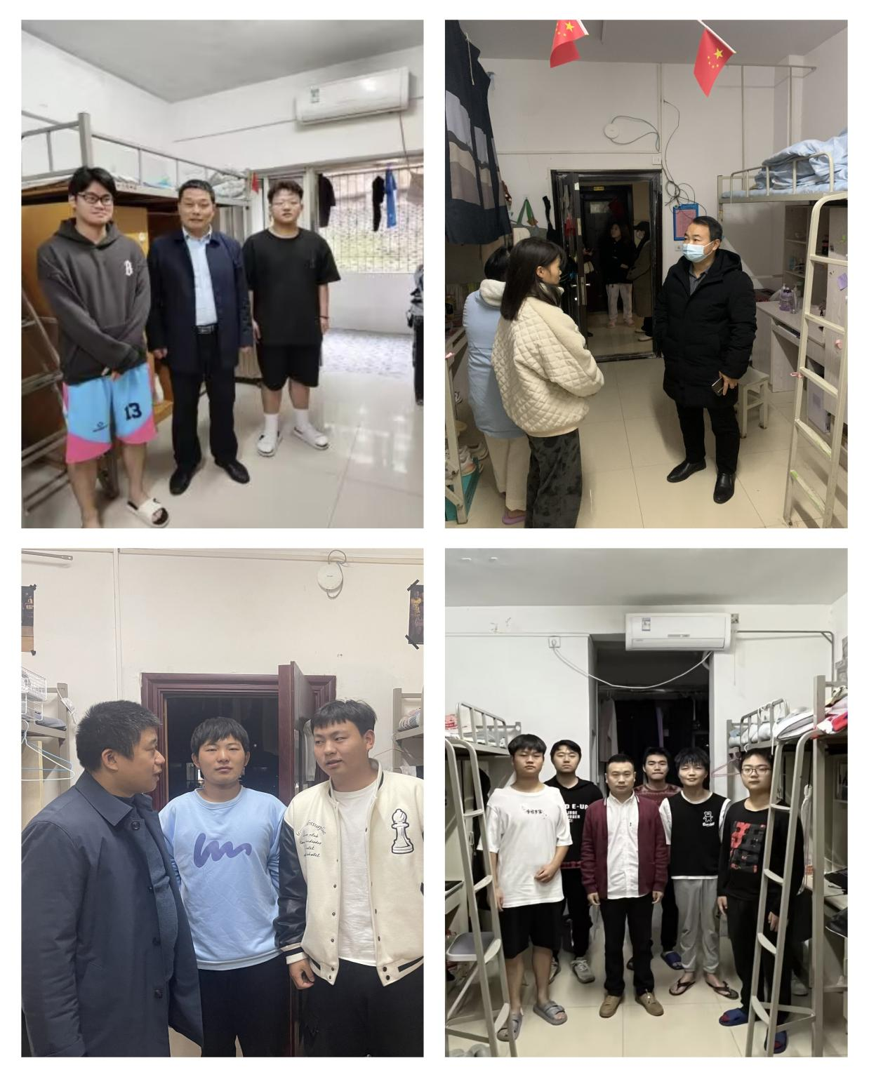 图3、4、5、6 教师一支部书记杨彦伟、伟德国际victor1946学生支部书记许维林、伟德国际victor1946党总支纪检委员邱家彩、教师二支部书记谢承在寝室与学生交流