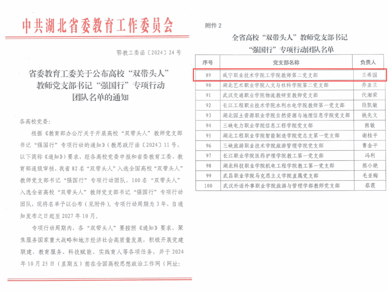 近年来,学校党委深入贯彻新时代党的建设总要求和党的组织路线,认真落实《普通高等学校教师党建和思想政治工作质量标准(试行)》,全面实施“时代新人铸魂工程”,开展十大建设行动,持续推进教师党支部书记“双带头人”队伍质量攻坚计划,培育3个“双带头人”教师党支部书记工作室,入选湖北省高职高专院校党建工作十佳案例。
