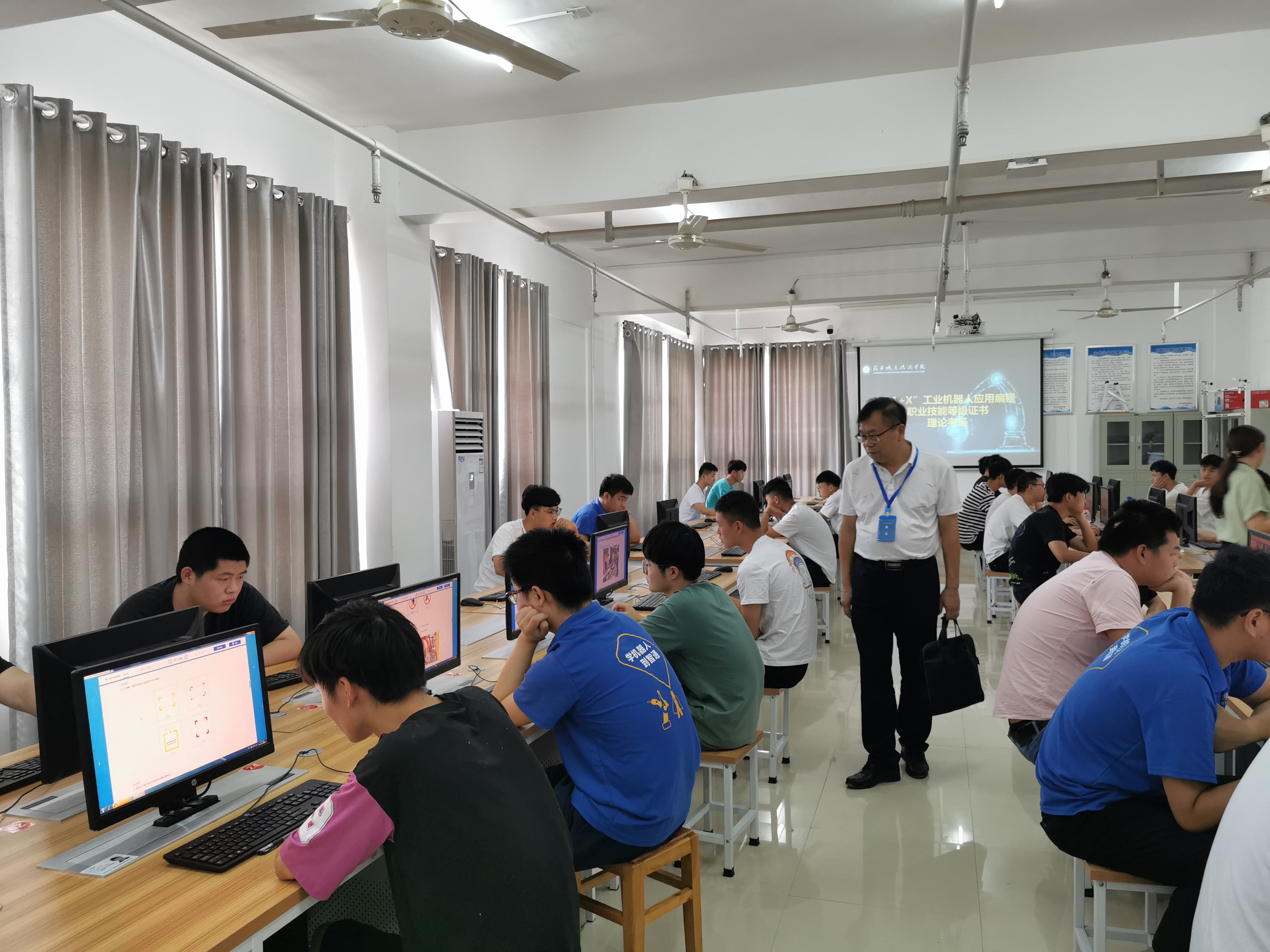 本次考核主要包括理论机试和实操考核两个阶段,19级工业机器人95名学生报名参加本次考核。考前工业机器人专业教师对学生进行了充分的培训和模拟,考核过程中同学们沉着答题,熟练实操,顺利完成了本次考核任务,通过率达75%。