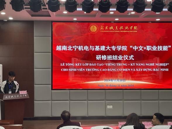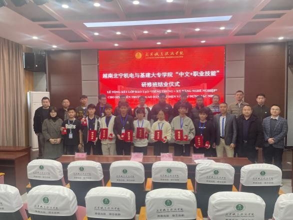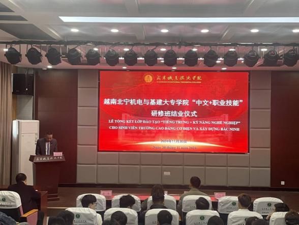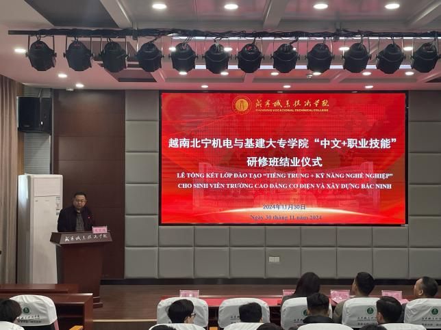 11月30日下午,越南北宁机电与基建大专学院“中文+技能”交流学习研修班结业仪式在我校教育实训实训中心201报告厅举行。此次结业仪式标志着学员们在中国文化学习与职业技能提升方面取得了阶段性的丰硕成果,也为中越教育交流合作增添了一抹亮色。