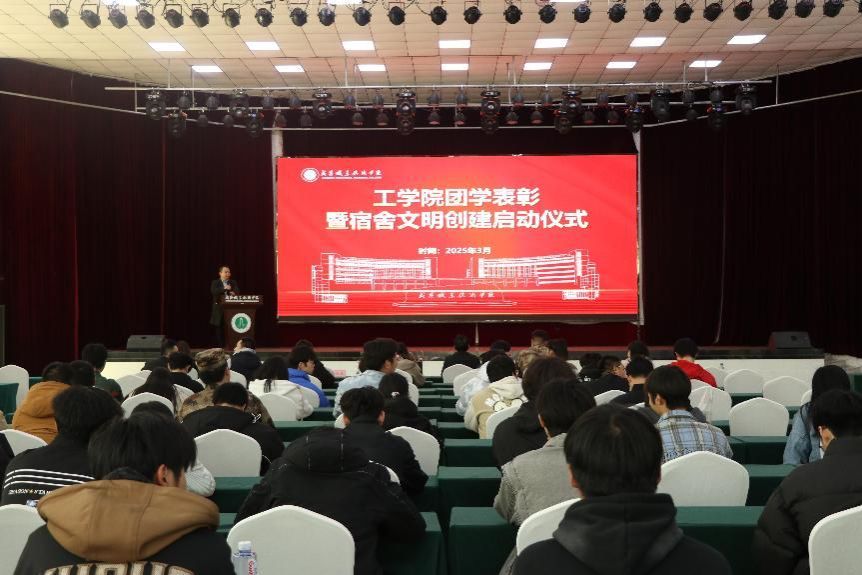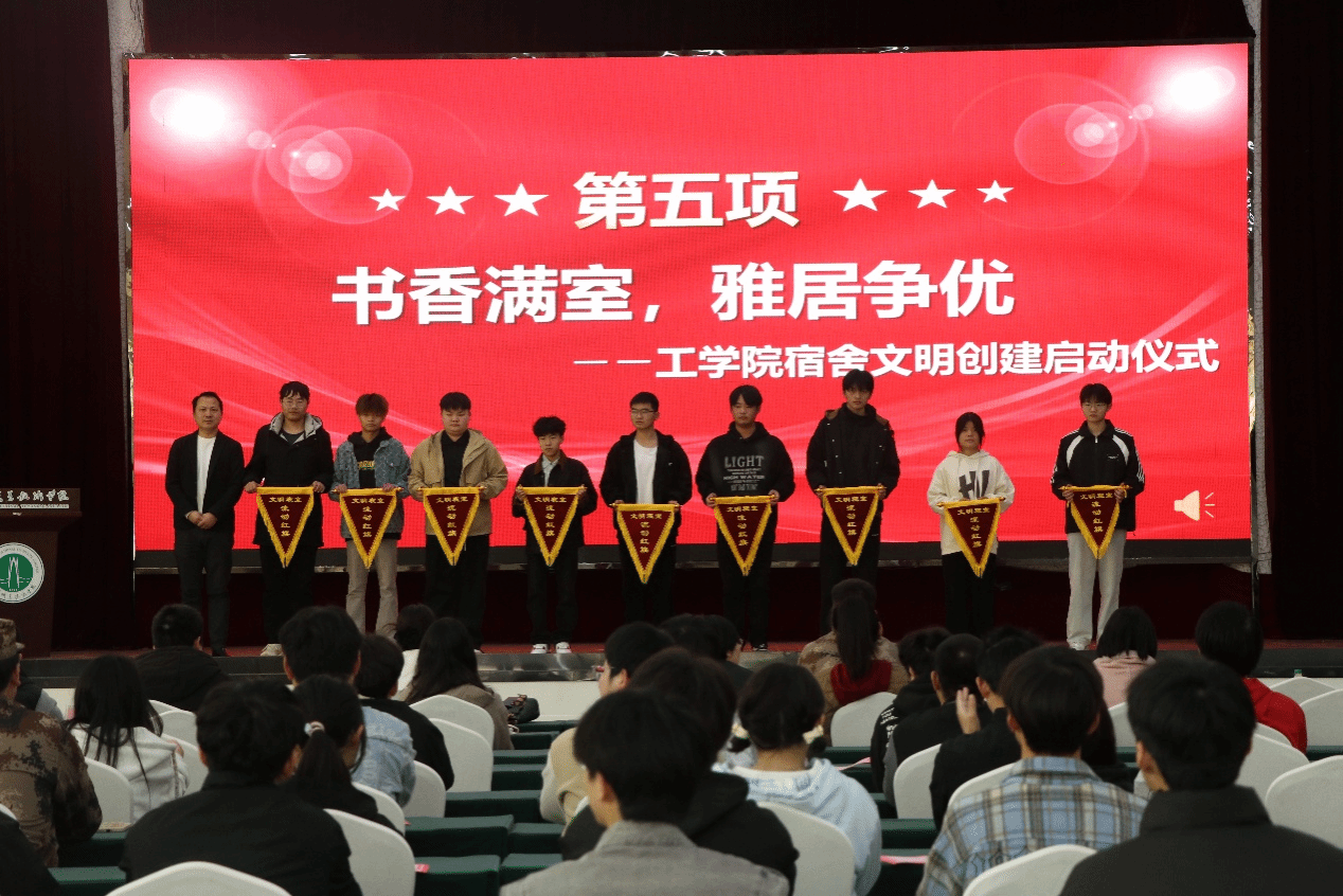 在表彰环节,大会共授予40名“优秀干事”、30名“优秀志愿者”荣誉称号,并表彰了10个“优秀团支部”。随后,以“书香满室,雅居争优”为主题的宿舍文明创建启动仪式正式拉开帷幕。许维林副书记详细解读了宿舍文明创建的实施方案,并向九个优秀文明寝室授予了流动红旗。辅导员代表应孔建与学生代表周子文分别发表动员讲话,表达了积极参与、全力推动宿舍文明创建工作的坚定决心。