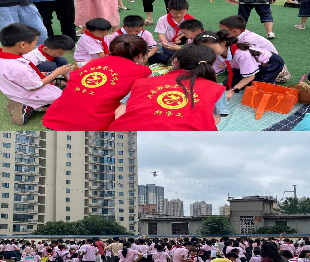 活动现场,无人机表演队驾驶五架无人机,组成了一大一小、一高一低、一前一后的无人机编队,在激昂的音乐声中翩翩起舞,展示出高超的飞行技艺。在场的孩子们无不被这壮观的场面所吸引,不时发出阵阵惊叹和欢呼。