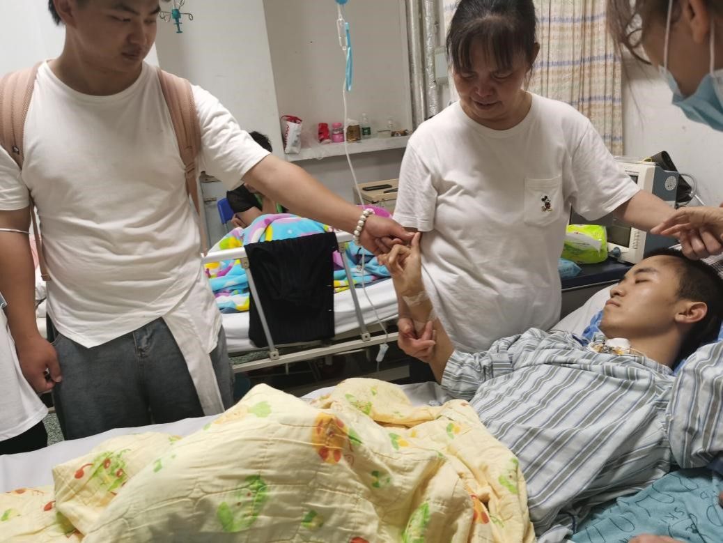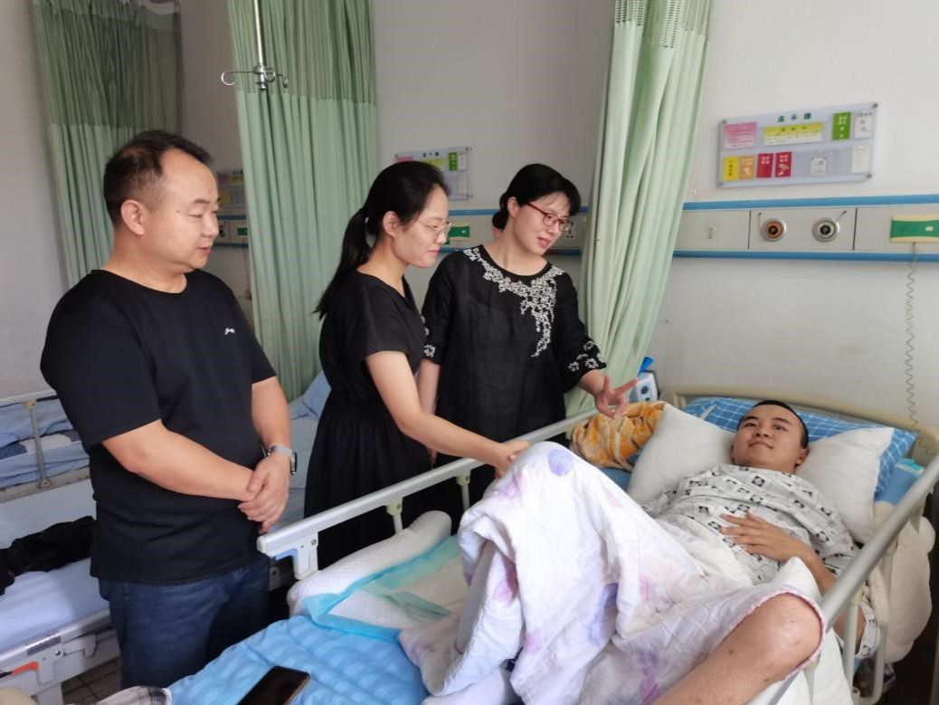 6月18日,辅导员彭老师和班上6名同学代表带着鲜花和水果见到了苏醒不久的王文同学,憔悴的样子让人心疼,此时的王文还不能发音,同学们加了王文姐姐的微信,通过语音、视频等形式鼓励他,目前他的情况正在好转。