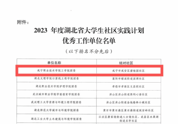 近期,团省委公布2023年度湖北省大学生社区实践计划优秀工作单位名单,经校团委组织申报、团省委审核遴选,伟德国际victor1946团总支获评2023年度湖北省大学生社区实践计划优秀工作单位。