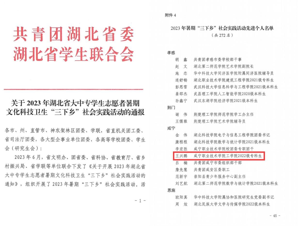 近日,团省委、省学联公布2023年湖北省大中专学生志愿者暑期文化科技卫生“三下乡”社会实践活动总结通报,伟德国际victor1946青年学生王兴鹏同学获评湖北省“三下乡”社会实践先进个人。