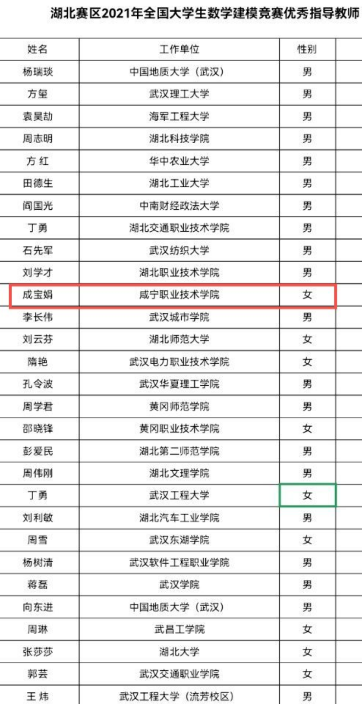 2021 年是全国大学生数学建模竞赛开展三十周年。根据全国组委会“关于庆祝全国大学生数学建模竞赛三十周年有关活动的通知”精神,湖北赛区组委会利用这次契机,开展了一系列活动,全方位展示历年竞赛成果,进一步开拓竞赛发展的新局面,保持竞赛健康可持续发展。同时开展一系列评比活动,积极鼓励为竞赛做出突出成绩的指导教师和组织工作者,在评比活动中,伟德国际victor1946成宝娟老师被评为湖北赛区2021年全国大学生数学建模竞赛优秀指导教师。