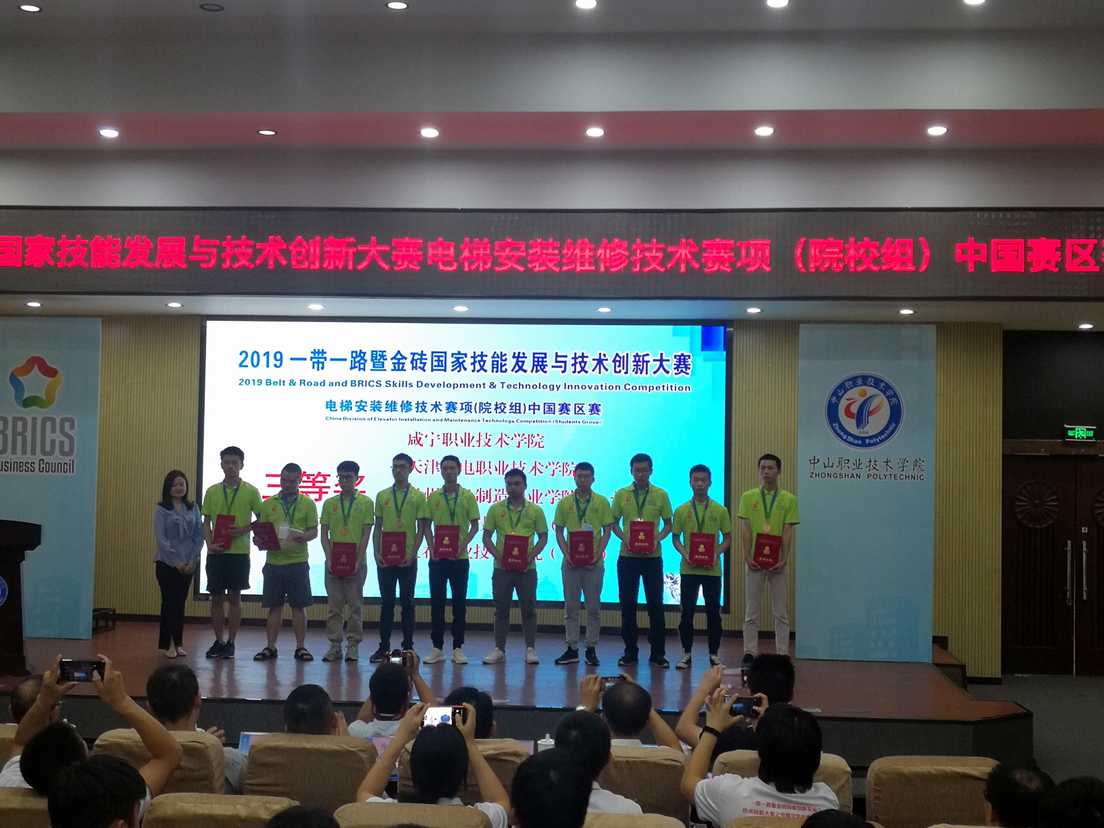 9月22日至9月27日2019一带一路暨金砖国家技能发展与技术创新大赛----电梯安装维修技术赛项在广东中山职业技术学院举行。此次活动有来自韩国、老挝及全国各地共49支代表队的98名选手参加了比赛,我校伟德国际victor1946学生代表队荣获“电梯安装维修技术”赛项三等奖。