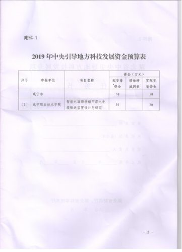 湖北省财政厅、科技厅联合开展的2019年中央引导地方科技发展专项资金申报工作中,我院徐文娟老师团队申报的科技创新示范项目“智能电液驱动船用岸电电缆输送装置设计与研究”获批准立项,并获国家资助资金50万元。全省77个立项资助项目中,该项目是唯一一个高职院校入选项目,也是我校第一个科技工作获得中央财政支持的项目。